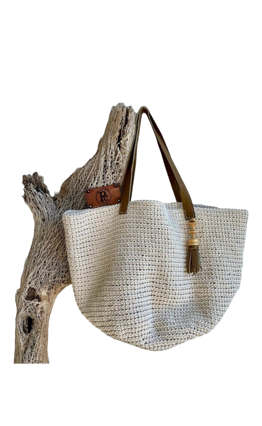 Está elaborado en hilo de algodón, asa de piel.