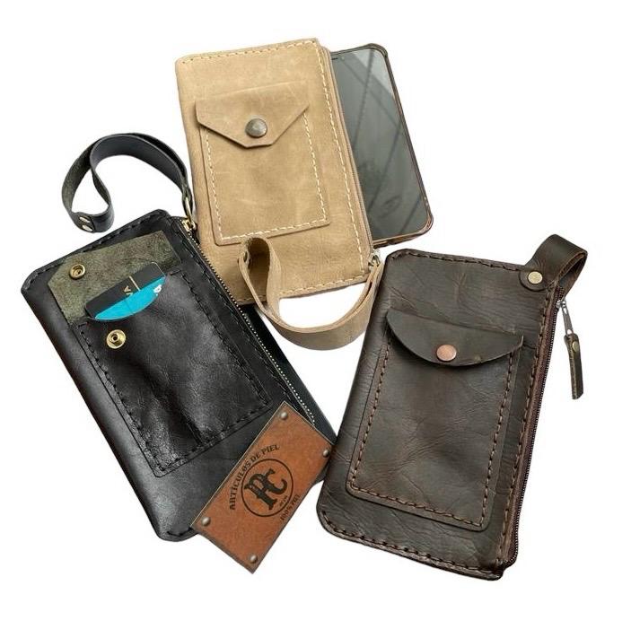 Elaborado en piel de res y correa de mano.